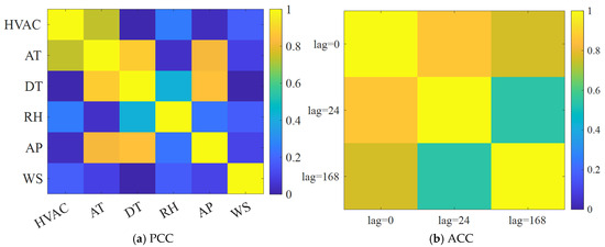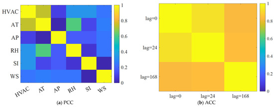 Historical load data are typically used to predict future load. However, in contrast to the conventional electricity load, the load patterns of HVAC also exhibit strong relevance to external environmental factors. For instance, high ambient temperatures often lead to lower temporary setpoints of HVAC, while high humidity levels may trigger increased use of ventilation modes. In this case, incorporating meteorological and environmental variables into the model can improve the forecasting accuracy. Nevertheless, not all potential input variables are strongly correlated with the HVAC load pattern. The variables with a weak correlation may introduce noise, which is harmful to the model’s performance. To address this issue, variable selection was conducted by calculating the Pearson Correlation Coefficient (PCC) [23,25], which detects the linear relationship between external variables and HVAC load. Meanwhile, the HVAC load at the same time stamp may exhibit a similar load distribution. Therefore, the Autocorrelation Coefficient (ACC) was also calculated to capture temporal dependencies in the historical load itself [36].