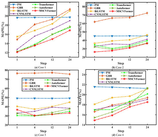 The MAPE of different steps: (a–d) represent the results in various cases of the WPuQ dataset.