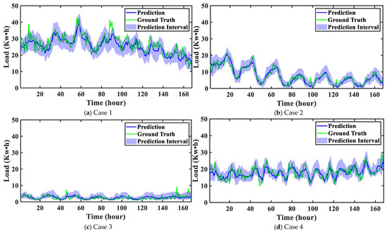 Table 5 displays the probabilistic load forecasting results when the confidence level is 90%. According to the experimental results, MSCVFormer achieves superior performance across all cases on both datasets, particularly in terms of PINAW, while maintaining high PICP values. On the WPuQ dataset, MSCVFormer consistently achieves low PINAW values in most cases, indicating narrower PIs compared to other methods, where PINAW values are reduced by 9.42% and 3.97% in Case 1 and Case 3, respectively. In Case 2 and Case 4, while the PINAWs of MSCVFormer are slightly higher than those of Autoformer, a competitive PICP is obtained, where the deviations between the PICP and the nominal confidence level are 0.01 and 0.003, which are lower than those of Autoformer. Notably, MSCVFormer overall outperforms Transformer and Autoformer. Furthermore, on the EnergyDetective2020 dataset, only MSCVFormer and Transformer achieve lower PINAW values in all four cases, whose PINAW is lower than 0.01, significantly outperforming other models. However, compared to Transformer, MSCVFormer obtains a higher PICP, where the deviations in the PICP with the nominal confidence level are 0.006, 0.019, 0.025, and 0.027. In summary, MSCVFormer can deliver accurate PIs with a narrow interval width and reliable coverage.