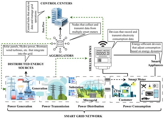 Advanced Metering Infrastructure (AMI) is a core element of SGs, implementing the use of smart meters to transmit and gather data regarding consumers’ electricity consumption and transfer that information to utility providers. The real-time transfer of this data enables utilities to understand demand fluctuations, energy consumption habits, and efficiency opportunities [13]. Moreover, the integration of renewable energy sources, such as solar panels and wind turbines, into SG systems is achievable with the help of highly advanced data communication and control systems. AMI systems also allow for automated billing, minimizing human error and ensuring accurate charge calculations [14].