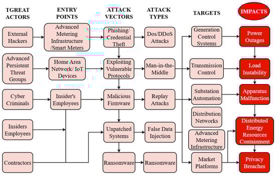 Comprehensive mapping of smart grid cybersecurity threats, showing threat actors, attack entry points, vectors, types, targeted systems, and resulting operational impacts.