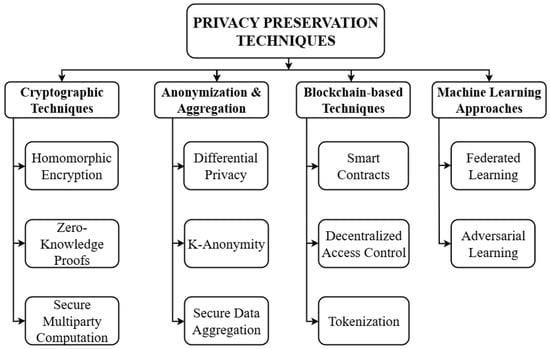 Since SGs are becoming an essential part of modern-day energy systems, it is of utmost importance to ensure the privacy of highly sensitive data, including the energy consumption patterns of consumers. An SG connects energy producers, consumers, and utility providers, and facilitates real-time communication. Nevertheless, the constant flow of data exposes consumers to vulnerabilities, particularly concerning data confidentiality. Preserving privacy in SG networks is aimed at protecting sensitive information, such as the energy usage of individuals, preventing unauthorized access, and mitigating the potential risks of privacy disclosure that arise from sharing this sensitive information. Various methods have been introduced in the literature, all of which aim to address a particular aspect of privacy and the secure transfer of information via the grid, as shown in Figure 3.