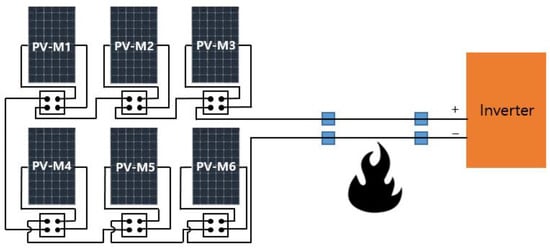 Figure 2 illustrates the experimental circuit setup. PV modules are linked in series. Meanwhile, the PV-M unit is connected in both series and parallel configurations across each module to facilitate real-time monitoring of voltage, current, and temperature. The positive (+) and negative (−) terminals of the circuit are connected to the inverter’s input ports. A fire simulation area was created between the PV modules and inverter. Herein, circuit breakers were placed at the zone’s input and output points to protect the system components. To more accurately validate electrical anomaly signals and fire precursor characteristics caused by insulation degradation in solar cables, this experiment was conducted using a test bed modeled on a grid-connected PV system. The approach was aimed at simulating a scenario that is more severe and adverse than typical pre-fire conditions. This was achieved by replicating an energy supply environment similar to that of a real system, where disconnecting power is more challenging than in standard load circuits. An important characteristic of these test beds is their capability to continuously apply DC voltage. This enables prolonged maintenance of electrical arcs. Therefore, to mitigate the risk of unintended incidents outside the experimental focus, circuit breakers and fuses were placed at both ends of the segment subjected to thermal stress.