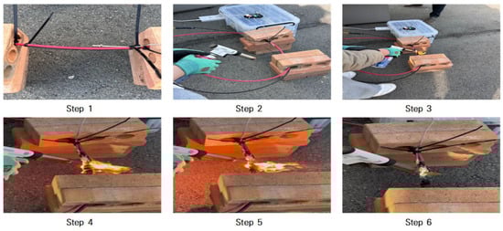 Figure 3 categorizes the cable’s heat accumulation process into six distinct steps. Step 1 represents the steady state in which no external heat source is applied to the cable. During this step, the cable surface maintains a standard temperature, and the PV modules produce typical voltage and current levels. Step 2 represents the initial phase of heat application to the cable. The first indications of insulation variations begin to appear in this phase. Step 3 represents the early phase of heat accumulation. The outer insulation layer begins to degrade during this phase, thereby exposing the inner insulation layer, making it visible to the naked eye. Step 4 represents the mid-phase of heat accumulation. It is characterized by the degradation of the inner insulation layer, which results in a visible exposure of the bare conductor. Step 5 signifies the advanced phase of heat accumulation. Both outer and inner insulation layers deteriorate in this phase, and thermal expansion of the exposed conductor is observed. Step 6 represents the full combustion phase. Herein, the insulation is consumed entirely by fire. No further variations occur following the thermal expansion of the exposed conductor.