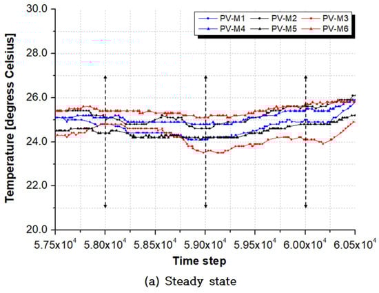 Figure 4a presents the voltage and current graph under steady-state conditions. The temperature of each PV module was observed to remain consistently within the range of 24–25 °C for 10 min and 43 s. The reference point data corresponding to Figure 4a are presented in Table 3. The temperature was analyzed across three distinct sections. The reference time step values were set at 58,000, 59,000, and 60,000 for the three sections.