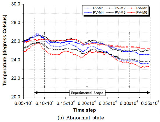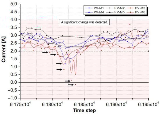 Figure 9b presents the graph under abnormal-state conditions. The heat accumulation experiment was conducted as detailed in Table 2. It revealed that the output current decreased from 4.5 to 5.0 A to approximately 2.5–3.5 A. Significantly, the current value of PV-M3 reduced significantly within the time step range of 61,750–61,950. Therefore, the segment depicted in Figure 9b was magnified. The voltage data spanning Time Steps 61,750–61,950 are displayed and examined in Figure 10. Table 11 summarizes the data showing a significant decrease in output current within the range of 2.5–3.5 A. Only data points with a reduction rate exceeding approximately 20% were selected and compiled.