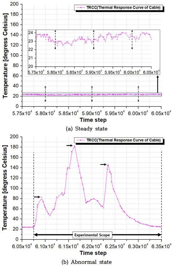Second, the study verified that the voltage and current fluctuations aligned with the stages of cable degradation during continuous heat accumulation. Prior to the main experiment, a trial section for grid connection was conducted. This section corresponds to the time interval between time steps 59,000 and 59,750 in Figure 7a. During this interval, voltage imbalance was observed in the graph; however, such imbalance did not occur in the main experimental section. Since the objective of this study is to analyze the differences between steady-state and abnormal conditions, the temporary voltage imbalance observed in the trial section was excluded from the analysis. Accordingly, the voltage value during the steady-state section was defined as the reference point for comparison with both the trial and abnormal sections. Under abnormal conditions, the analysis focused on changes observed in the Heat Accumulation Area (HAA), with particular attention given to the voltage and current data within this region. These changes may serve as precursors to PV cable fire hazards and, therefore, should be interpreted with caution. Special attention must be paid to the rates of voltage rise and drop.