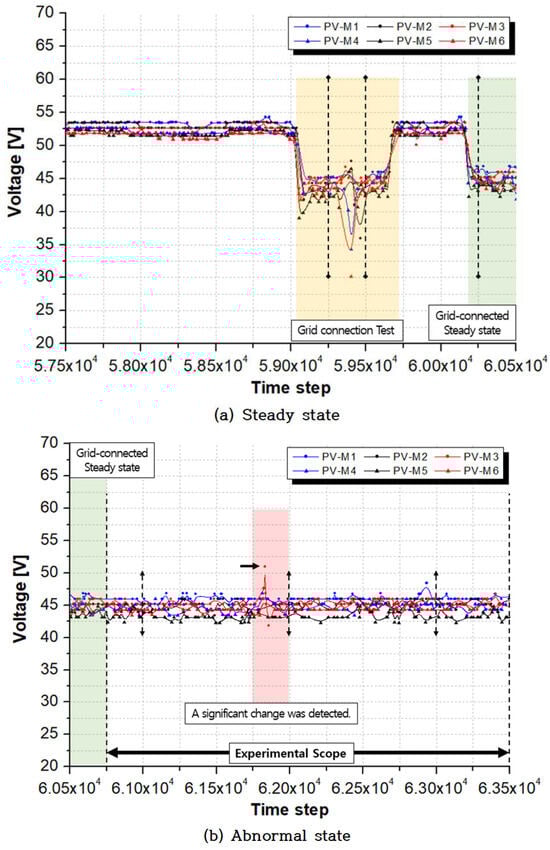 Figure 7 presents a graph illustrating the voltage data from modules PV-M1–PV-M6. Figure 7a presents the graph under steady-state conditions. The solar power system was test-connected to the grid through the inverter at Time Step 59,040 (corresponding to 16:41:40). The test connection was completed at Time Step 59,670 (corresponding to 16:43:54). During the initial test run (which lasted approximately 2 min and 14 s), voltage fluctuations were observed. However, the system attained a peak output voltage of approximately 45 V. Figure 7a illustrates that the PV module’s open-circuit voltage is approximately 53 V. The peak output voltage is observed at approximately 80% of the open-circuit voltage, as expressed in Equation (5). The experiment demonstrated that the maximum output voltage attained was approximately 45 V. This equates to approximately 85% of the open-circuit voltage.