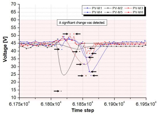 In the experiment, the solar power plant was linked to the grid at 16:45:49 (time step 60,160). This generated an output voltage of approximately 45 V, which aligned with the results observed during the initial test run. To evaluate the output voltage patterns under steady state conditions, the three selected sections were analyzed. The data are summarized in Table 7. Figure 7b presents the graph under abnormal-state conditions. The heat accumulation experiment proceeded as outlined in Table 2. Voltage data were collected from the three selected sections throughout the test. The reference time steps for the sections are 61,000, 62,000, and 63,000. The corresponding data are compiled in Table 8. In addition to the reference values, a voltage surge was detected in the PV-M3 module. Consequently, the segment depicted in Figure 7b was magnified. The voltage data spanning Time Steps 61,750–61,950 are displayed and examined in Figure 8. Table 9 and Table 10 summarize the data exhibiting increases and reductions, respectively, compared with the baseline output voltage of approximately 45 V.