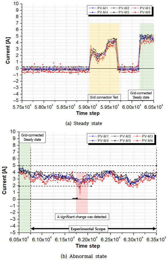 Figure 9 presents a graph illustrating the current data from modules PV-M1–PV-M6. Figure 9a presents the graph under steady-state conditions. The start and end times of the grid connection via the solar power plant’s inverter correspond to those detailed earlier in the explanation of the voltage graph. The initial test operation followed the procedure outlined in the voltage graph analysis. It yielded an output current of approximately 4.5 A. In this experiment, the output current was observed to range between 4.5 and 5.0 A.