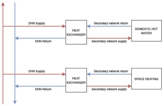 1] defined district heating substations as a complex of equipment that separates district heating networks (outside the building) originating from heating installations (inside the building). There are different possibilities for designing a DHS, including parallel and serial connections, as well as the purpose of application, for example, space heating (SH) and domestic hot water (DHW). A simplified example of a district heating substation is shown in