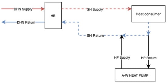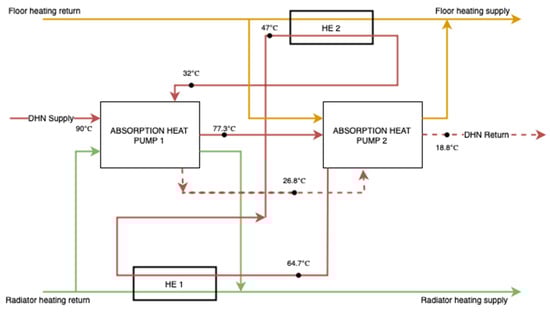 31] discussed control strategies for dual-temperature district heating substations, which aimed to improve energy efficiency using the specifications of internal heating distribution systems and two additional heat sources—absorption heat pumps (AHPs). The scheme of the system is presented in