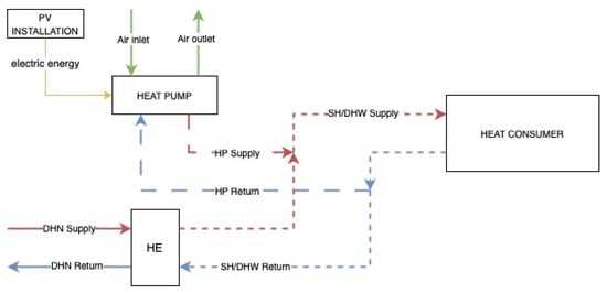 23] developed several distinct variants of a computational model of a district heating substation under Polish climate conditions. Calculations were conducted based on historic data. One of these variants involved the use of a compressor air–water (A-W) heat pump installed on the secondary (consumer) side of the DHS. In this concept, the A-W heat pump is connected to the return of the heating system before the heat exchanger. It was assumed that a certain amount of water would be heated to 55 °C and then mixed with the remaining water flow just before entering the secondary side of the main heat exchanger. The PV installation connection with the heat pump is also considered. The scheme of the system is presented in