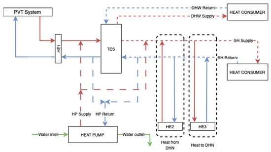 26], the researchers examined three configurations of the PVT system integrated with a DHN for a multifamily building under Central European conditions. Two of the proposed configurations assumed PVT’s heat production for DHW and SH demand and cooperation with thermal energy storage, including one in which the waste heat is directed to the return pipeline of the district heating network. The third configuration assumed that the PVT system operates as a micro-installation producing heat only for DHN purposes. In this configuration, no water tank was used, but the power of the HP had to be increased. All configurations assumed that produced electric energy was sold to the electrical grid. The hybrid system configuration is shown in