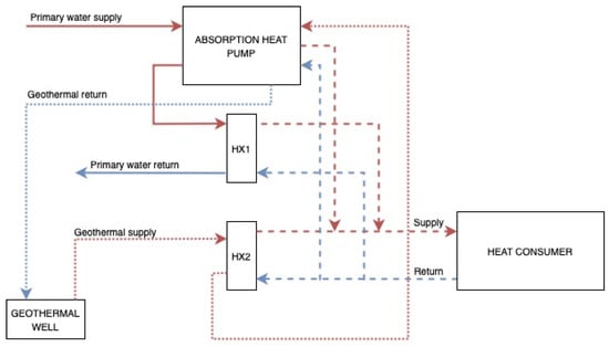 32] investigated the integration of a district heating substation with an absorption heat pump with the aim of improving the utilization of a low-temperature geothermal energy source. The designed system was simulated to assess how different operational parameters could affect the performance of the AHP. The scheme of the system is presented in