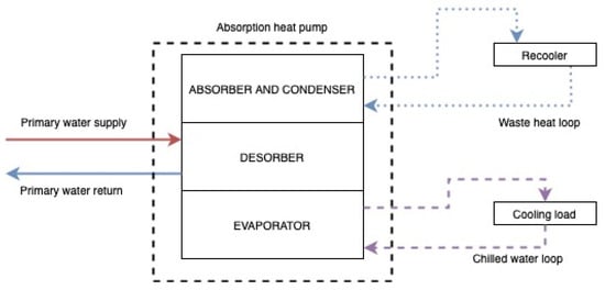 38] examined the possibility of using absorption heat pumps in current high-temperature and future low-temperature district heating substations. One of the advantages of using an AHP in a DHS is its option to operate in cooling mode. The operation of the AHP in cooling mode enables it to cover the cooling demand of buildings, as cooling demand will increase in the future due to changing climate conditions. It also creates new opportunities for the development of new business models by district heating companies. A simplified scheme of the AHP operating in cooling mode is presented in