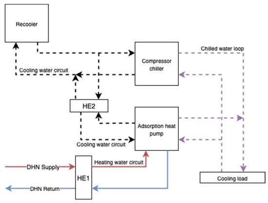 42], the authors proposed a hybrid cooling system for a building based on two cold production devices—an electric chiller and an adsorption heat pump driven by heat from the district heating network. Two main parts of the modeled configuration are the chilled water distribution system (operating under variable flow conditions) and the hybrid air conditioning system. Due to the high sensitivity of the adsorption heat pump to external parameters, high thermal inertia resulting in restricted control strategy and high investment costs, the implementation of two complementary cold sources could increase the potential of utilizing primary heat, renewable heat or waste heat in cold production. Sixteen scenarios were evaluated in the study, which varied depending on how the components were connected. The exemplary system configuration is shown in