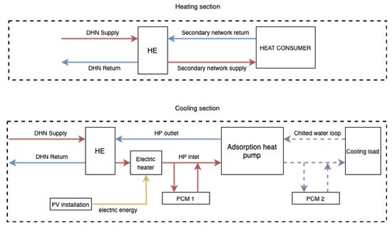 The newly added part of the system is divided by the adsorption heat pump into two subsystems. The hot circuit provides the heat supply to the adsorption heat pump from the DHN, while the cool circuit supplies the cooled medium to the cooling distribution system. The PCM storages are connected to both circuits. The purpose of the PCM storage in the cooling circuit is to balance the cold demand from the building by covering the cooling demand in peak hours. On the heating circuit side, an electric heater connected to the PV system and the PCM storage is included. The electric heater enables an increase in the temperature at the inlet to the storage up to 85 °C and then to the adsorption heat pump, which could result in higher COP and cooling capacity. Both storages could allow the implementation of more efficient control strategies for the HDHS. In [