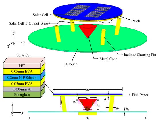 Structure of the proposed antenna with a solar cell. Dimensions: h1 = 1 mm, h2 = 12 mm, h3 = 1 mm, h4 = 3 mm, d1 = 18.4 mm, d2 = 1.4 mm, d3 = 120 mm, d4 = 70 mm, d5 = 4 mm, α = 10°.