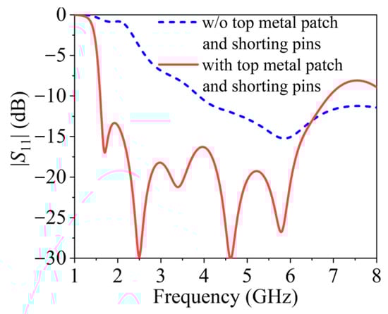 Simulated S-parameters of the antenna with and without the top metal patch and shorting pins.