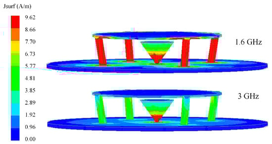 The discone antenna can achieve broadband operation when its profile height is comparable to one-eighth of a wavelength. In order to further reduce the profile of the antenna, a top-loaded antenna was proposed [20,21,22,23]. In this paper, an improved discone antenna with a loaded patch and shorting pins is proposed to reduce the profile of the antenna. The operating frequency range of the antenna can be divided into two parts. The metal cone radiates as a monopole working at higher frequencies. At lower frequencies, the patch and shorting pins function as the radiator, which is fed by the metal cone. Thus, by controlling the size of the patch and the shorting pins, the lowest operating frequency of the antenna can be controlled. Figure 2 compares the simulated S-parameters with and without the patch and shorting pins. It can be seen that without the structure, the lowest resonant frequency is around 3 GHz. When the structure is introduced, the lowest resonant frequency is reduced to 1.6 GHz. To better understand the working principle, Figure 3 illustrates the surface current of the antenna at 1.6 and 3 GHz, respectively. As shown, the surface current is larger at 1.6 GHz than at 3 GHz. This proves that the shorting pins are the main radiator.
