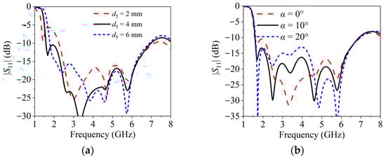 Simulated S-parameter of the antenna varies with the shorting pins’ design parameters. (a) d5. (b) α.
