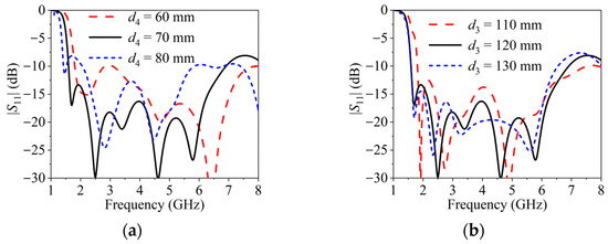 Simulated S-parameter of the antenna varies with the diameter of the patch and the ground plane. (a) d4. (b) d3.