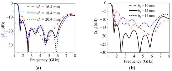 Simulated S-parameter of the antenna varies with the cone’s design parameters. (a) d1. (b) h2.