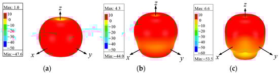 Simulated 3D radiation patterns of the proposed antenna with a solar cell. (a) 1.6 GHz. (b) 2.6 GHz. (c) 3.6 GHz.