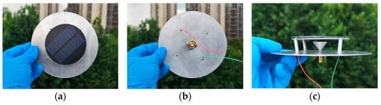 Photograph of the fabricated antenna integrated with a solar cell. (a) Top view. (b) Bottom view. (c) Side view.