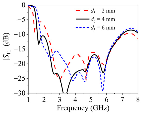 The shorting pins are set at the edge of the patch to lead out the wire of the solar cell. The DC output wires of the solar cell are routed through the hollow center of the shorting pins. So, the wires would not couple to the electromagnetic fields. Another function of these pins is to work as the upholder of the top metal patch. According to the above analysis, the four shorting pins have an effect on the low frequency of the antenna. Figure 4a shows the simulated |S11| of the antenna when the diameter of the shorting pins d5 changes. It can be seen that the lowest resonant frequency of the antenna moves to a lower frequency as d5 decreases. The shorting pins are inductive. As the d5 decreases, the inductance increases. Thus, the lowest resonant frequency decreases. By adding the shorting pins, a frequency resonance at around 1.6 GHz is formed. In our design, the frequency range aims to cover 1.8 to 3.6 GHz. So, d5 = 4 mm is selected to have a good impedance bandwidth. Moreover, the shorting pins were designed to be inclined to adjust the antenna’s impedance to 50 Ω across a broad bandwidth. Figure 4b shows simulated |S11| of the proposed antenna as a function of the shorting pins’ inclination angle α. As shown, when the angle changes from 0° to 20°, the bandwidth of the antenna is almost unchanged. As shown in Figure 4b, as α decreases, |S11| degrades in the 1.6–2.5 GHz and 4.5–6 GHz bands but gets better between 2.5 and 4.5 GHz. Through comprehensive evaluation, α = 10° maintains a consistently low |S11| across all frequencies. Therefore, α = 10° is selected.