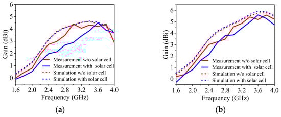 Simulated and measured gain of the proposed antenna with and without the integrated solar cell. (a) φ = 0°, θ = 45°. (b) φ = 45°, θ = 45°.