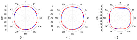 Simulated and measured 2D radiation patterns of the proposed antenna with a solar cell when θ = 90°. (a) 1.6 GHz. (b) 2.6 GHz. (c) 3.6 GHz.