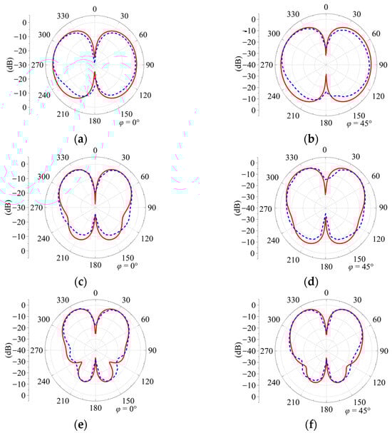 Simulated and measured 2D radiation patterns of the proposed antenna with a solar cell. (a) 1.6 GHz, φ = 0°. (b) 1.6 GHz, φ = 45°. (c) 2.6 GHz, φ = 0°. (d) 2.6 GHz, φ = 45°. (e) 3.6 GHz, φ = 0°. (f) 3.6 GHz, φ = 45°.