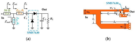 Figure 14 depicts the schematic and layout of the proposed broadband rectifier circuit with all design parameters. As shown in Figure 14a, the circuit was designed based on the voltage doubler topology to increase the output DC voltage and achieve a broad bandwidth [24]. The rectifier circuit comprises a single-stub matching network (TL1 and TL2), a DC block capacitor (C1), two Schottky diodes (SMS7630-040LF), a bypass capacitor (CL) and a load (RL). The load resistance RL is set to be 1 kΩ. The characteristic impedance and electrical length of the ith transmission line TLi is Z0i and θi (i = 1, 2). In Figure 14b, the transmission line TL2 is folded to minimize the circuit size.