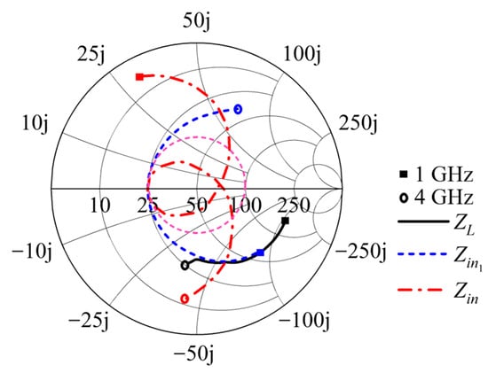As shown in Figure 15, there are two steps to designing the wideband matching network. In the first step, the locus of Zin1 can be obtained from the clockwise rotation of the ZL locus by a series transmission line, TL1. Before TL1 is introduced, ZL = (78.95 − j98.2) Ω at 1.6 GHz and ZL = (31.8 − j40.8) Ω at 3.6 GHz from the simulated results in Figure 15. After TL1 is introduced, we obtain