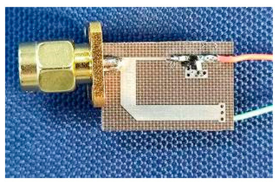 To verify the design concept, the proposed broadband rectifier circuit shown in Figure 16 is fabricated and measured. The substrate employed in the design is 0.8 mm F4B, with a relative dielectric constant of 2.6 and loss tangent of 0.002. Two Schottky diodes, SMS7630, are used. The values of the DC block capacitor and bypass capacitor are 62 and 820 pF. The output load RL is 1 kΩ. The dimensions of the rectifier are 21 × 14 mm2. In the experiment, A microwave source is used to generate RF power Pin. And the voltage on the load Vout is measured by a multimeter. The PCE can be calculated by