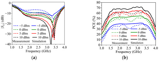 Figure 17 illustrates the simulated and measured |S11| and PCE versus frequency at different input power levels, respectively. It can be seen that the simulated results agree well with the measured ones, except that the measured PCE has slight degradation. This is due to the greater actual losses in the rectifier circuit compared to simulation predictions. In the measurement, at an input power level of 10 dBm, the rectifier maintains an efficiency exceeding 55% across the 1.5 to 3.6 GHz band, with a fractional bandwidth (FBW) of 82.3%. At an input power of 5 dBm, it maintains an efficiency exceeding 50% across the 1.4 to 3.6 GHz band featuring an FBW of 88% and |S11| below −10 dB across the 1.65 to 3.67 GHz band featuring an FBW of 75.9%. When the input power level reduces to 0 dBm, the measured PCE remains above 40% across 1.4 to 3.6 GHz. In addition, at an input power level of −5 dBm, the efficiency remains above 30% over 1.5 to 3.6 GHz. Moreover, the PCE reaches its peak value at 3.3 GHz.