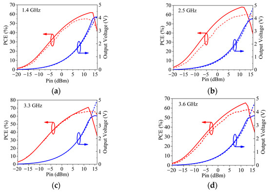 Simulated and measured PCE and output voltage versus input power level with a load of 1 kΩ. (a) 1.4 GHz. (b) 2.5 GHz. (c) 3.3 GHz. (d) 3.6 GHz. (Solid line: simulation results; dashed line: measurement results.)