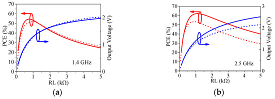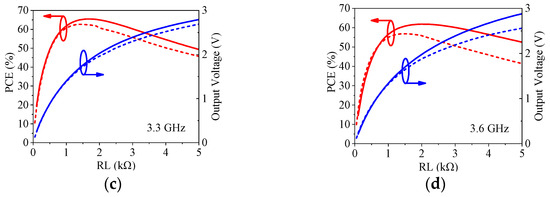 Figure 19 presents the measured PCE and output DC voltage versus load resistance at 1.4, 2.5, 3.3, and 3.6 GHz, respectively, when the input power is 5 dBm. The measured PCE reaches its peak value when the load is 0.95, 1, 1.4, and 1.7 kΩ, respectively. The measured curves exhibit a trend consistent with the simulated curves, except for a slight deviation. This may be caused by the deviation of the diode’s simulation model and actual device.