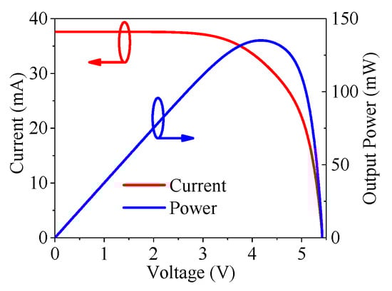 The current–voltage (I-V) curve of the solar cell under standard global AM1.5 illumination conditions is shown in Figure 20. The measurements show an open circuit voltage of 5.415 V and a short circuit current of 37 mA. The maximum power is 135.1 mW, corresponding to 4.17 V and 32.3 mA.