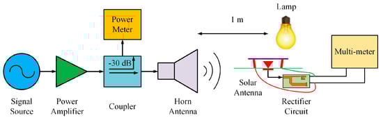 Figure 21 illustrates the measurement setup of the RF-solar energy harvesting system. The rectenna under test is placed 1 m away from the transmitting antenna. In this design, we utilize a polycrystalline silicon solar cell with a diameter of 70 mm to harvest solar energy. The solar cell is placed above the metal patch so that the solar cell is not completely covered by any object. As shown, the test setup employs a standard gain horn antenna as the transmitting antenna. A microwave source is used to generate microwave signal and then it is amplified by a broadband power amplifier. The 30 dB coupler and power meter are used to measure the transmitting power of the transmitting antenna. The output power of the solar cell and rectenna is combined by a parallel connection [13]. It is assumed that their output DC power will combine. In the measurement, the antenna is connected to a power meter to measure the received microwave power, which is also the input power of the rectifier. Then, the output DC power is measured by a multimeter. This testing method has been widely used in previously published papers [31,32].
