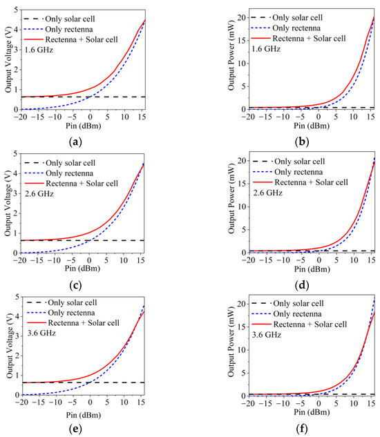 In the measurement, the output voltage of the solar cell is 0.64 V with a load of 1 kΩ. Figure 22 compares the output DC voltage and the power versus input power level in three energy harvesting situations. At 1.6, 2.6, and 3.6 GHz, the output voltage of the rectenna varies from 0.015 to 4.5 V, 0.0124 to 4.6 V, and 0.017 to 4.62 V, respectively, when the input power level ranges from −20 to 16 dBm with a load of 1 kΩ. When the input power of the rectenna reaches 0 dBm, the output power of the rectenna approaches what the solar cell generates at three frequencies. It can be observed that the output DC power of the hybrid energy harvester at the three frequencies is 20.25, 19.89, and 18.23 mW, which is almost 49 times that of the single solar cell’s 0.049 mW output power at an input RF power of 16 dBm. The measured results prove that the solar cell and the rectenna can work together, and both contribute to the output DC power.