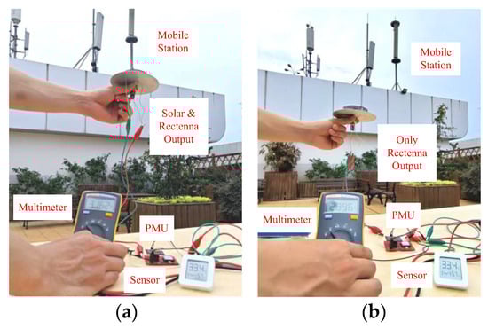 Figure 23 illustrates the test scenario of the hybrid energy harvester and only the rectifier during the daytime. The experiment was conducted under conditions with a clarity index close to 1. A temperature and humidity sensor operating at 3 V was employed as the load. Due to the low ambient RF energy density and temporal signal variations in outdoor environments, a power management unit (PMU) is needed, which incorporates a bq25504 chip that can boost the output voltage and a 50 mF supercapacitor that can store the harvested energy. Figure 23a shows that during daytime, the solar cell and rectenna can work together to enable the sensor to operate, while Figure 23b demonstrates that at night, the rectenna alone can function to keep the sensor working.