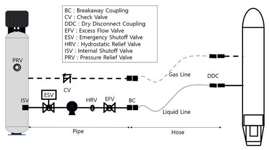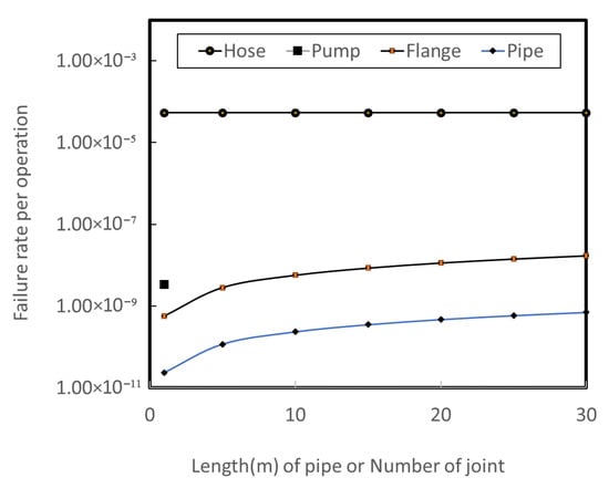 The likelihood of an accident during bunkering, based on the total pipe length or the number of flanges used in unloading line, is shown in Figure 3. The likelihood of failure for a flexible hose, which is on the order of 10−5, is roughly 100 times higher than that for 10 m of pipe and twenty flanges used in a tank truck unloading line, which are on the order of 10−7. This indicates that, based on historical accident data, flexible hoses are more prone to failure during the bunkering process, and it is crucial to reduce the failure rate of flexible hoses to align with the failure rates of other components.