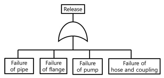 The fault tree analysis (FTA) for ammonia release during the bunkering process from a tank truck to ships is shown in Figure 2. The components of the tank truck bunkering system include pipes, flanges, pumps, and flexible hoses. The failure frequency of each piece of equipment during bunkering is generally estimated using data derived from statistical analysis of accident occurrence. The failure probability of each component for one-hour bunkering operation is shown in Table 1, with the time unit converted into bunker operation time using UK HSE data [12]. The UK HSE data is based on historical incident reports, industry safety databases, and regulatory agencies, which track and analyze failure rates and accidents across various industries, including transportation, chemical handling, and infrastructure. Since most tank trucks operate on land, HSE failure data is used in this study. However, if tank trucks remain on the coast for extended periods, adjustments may be necessary to account for marine conditions, such as corrosion.