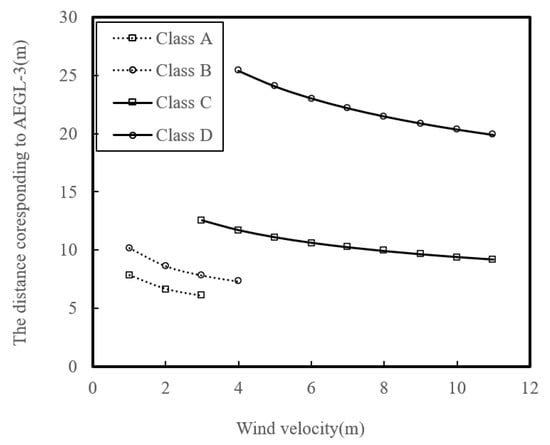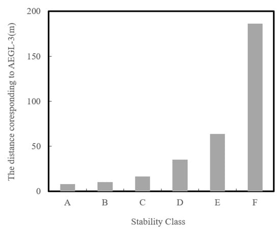 Figure 5 shows the distance corresponding to AEGL-3 during the daytime, assuming the total released ammonia is 1 kg, in order to comparatively examine the fatal distance based on atmospheric stability. The worst-case weather conditions during the daytime are represented by atmospheric stability class D and wind speed of 4 m/s, as shown in Figure 5. Under the condition, by using Equation (10) and Table 5, the distance corresponding to AEGL-3 is given by: