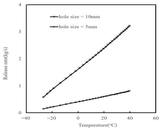 When ammonia is released through a hole corresponding to the diameter of a hose, the damage distance can be quite large. Therefore, such release should be prevented with appropriate safety measures. An alternative accident scenario is a leak from a hole that is 20% of the diameter of hose [19]. Most liquid hose used in tank trucks has an inner diameter of 50 mm. The release rates of ammonia from holes that are 10% and 20% of the hose’s diameter are shown in Figure 6 [18]. The release rate increases with temperature due to the vapor pressure increasing with temperature, reaching up to about 3.3 kg/s.
