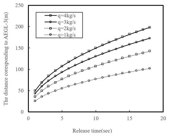 As shown in Figure 7, the distance corresponding to AEGL-3 increases with the release time of ammonia, from the point it starts to the moment it is stopped by safeguards. The distance can reach several hundred meters, even if the release is stopped in just a tens of seconds. Therefore, in the event of an ammonia release accident, it is crucial to quickly activate safeguards to stop the release and reduce the damage. To minimize the release time from a hole in the hose, EFVs and ESVs on the tank truck side and a check valve on the ship side should be activated in a few seconds.