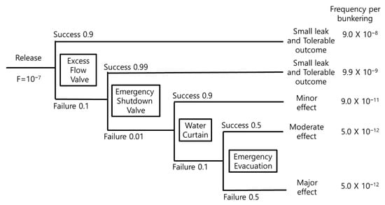 Figure 6 shows the layers of protection to reduce damage after the release. The starting failure rate per bunkering is 1 × 10−7, as it will be on the order of 10−7, as discussed in Section 3.1. The first layer of protection is the EFV. Since the possibility of EFV failure on demand in the bunkering line may be higher than in a normal chemical process, as discussed qualitatively in Section 3.2, the probability of EFV failure on demand is assumed to be 1 × 10−1, despite the value of 1.3 × 10−2 as shown in Table 1.